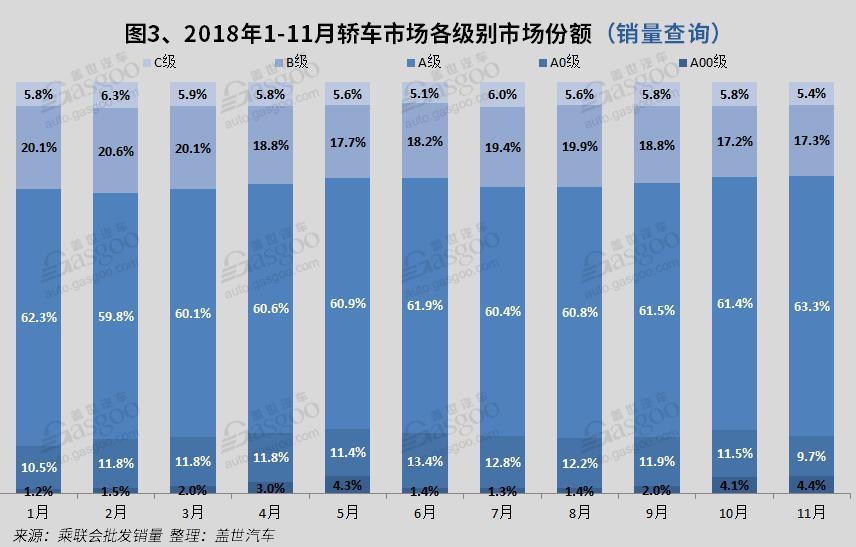 根据盖世汽车研究院整理的数据,2018年11月,乘用车市场销量214.3万辆同比下跌16.1%,全年累计销量2107.1万辆同比下跌2.5%。国内轿车销量108.5万辆,同比下跌11.9%,跌幅扩大,轿车在乘用车市场的销量占比达51%。