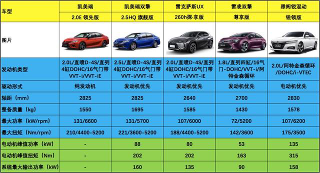 这一款全新混动发动机已经在雷克萨斯UX上搭载,我们用如下的表格来对比这一款2.0L混动系统与1.8L混动、2.5L混动、雅阁2.0L混动系统的差异。