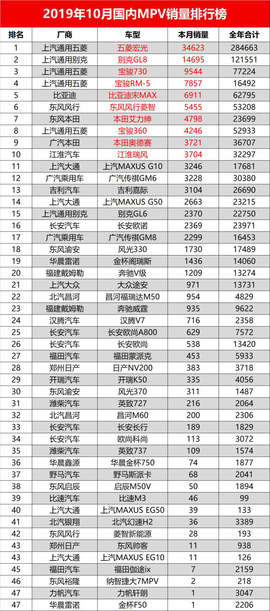 2019年10月国内MPV销量排行榜(前十名单):1.五菱宏光 34623辆;2.别克GL8 14695辆;3.宝骏730 9544辆;4.宝骏RM-5 7857辆;5.比亚迪宋MAX 6911辆;6.东风风行菱智 5455辆;7.本田艾力绅 4798辆;8.宝骏360 4246辆;9.本田奥德赛 3721辆;10.江淮瑞风 3704辆。