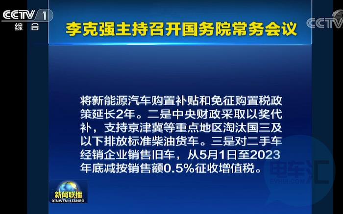 3月31日,国务院总理李克强主持召开国务院常务会议,会议指出,为促进汽车消费,会议确定,一是将新能源汽车购置补贴和免征购置税政策延长2年。二是中央财政采取以奖代补,支持京津冀等重点地区淘汰国三及以下排放标准柴油货车。三是对二手车经销企业销售旧车,从5月1日至2023年底减按销售额0.5%征收增值税