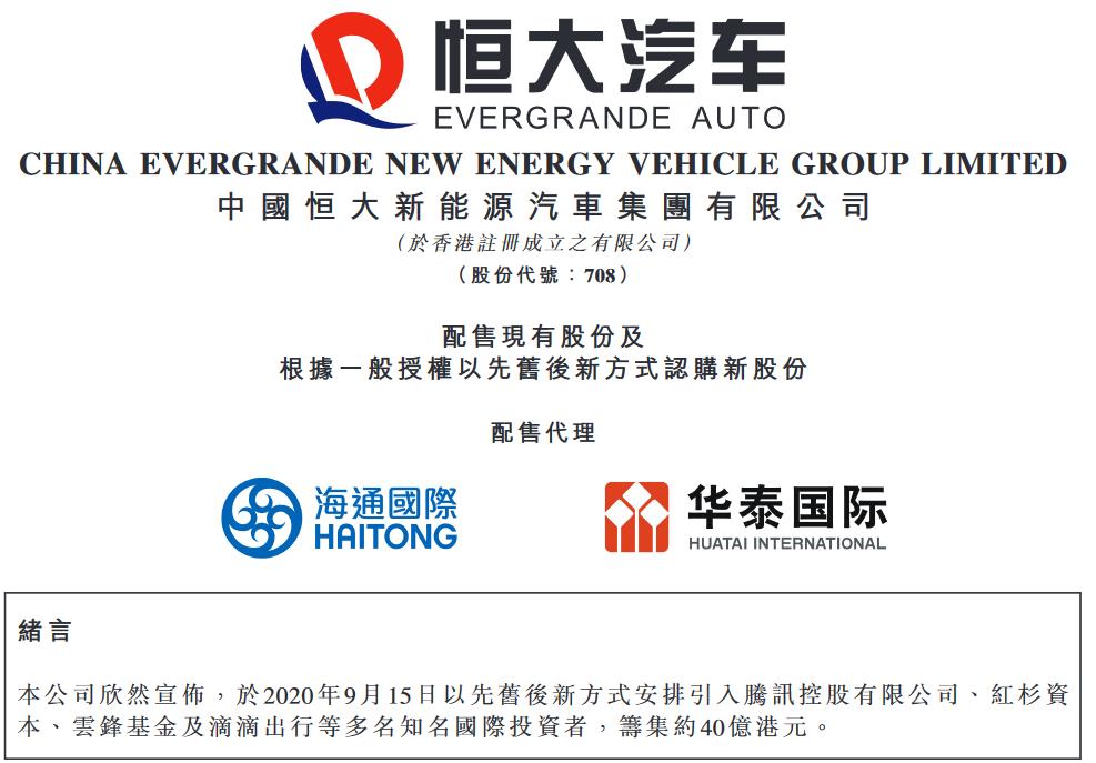 9月15日,恒大汽车(00708.HK)发布公告称,以先旧后新方式安排引入腾讯控股有限公司、红杉资本、云锋基金及滴滴出行等多个知名国际投资者,筹集约40亿港元。