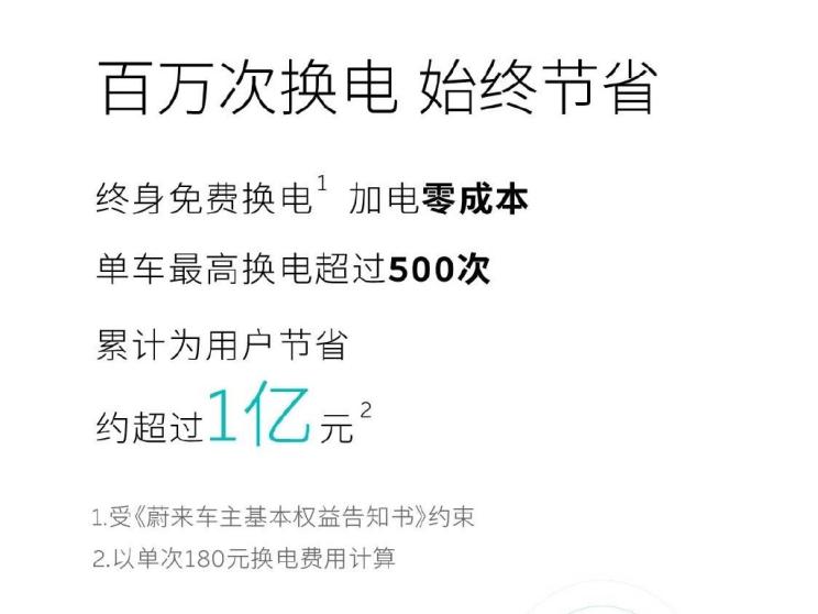 根据蔚来官方表示,目前换电次数最高的车辆累计已经超过500次。值得一提的是,蔚来旗下车型均可享受终身免费换电政策,而百万次换电也为用户节省用车成本累计超过1亿元。