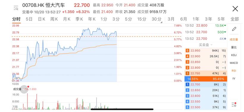 或受上述消息影响,截至10月20日下午开盘,恒大汽车(00708,HK)股价涨幅6.56%,报22.75港元/股。