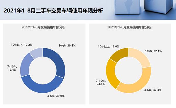 值得注意的是,我国二手车交易年限有明显缩短趋势。今年前8月,3年内车龄交易占比为30.5%,同比增加8.4%;3-6年车龄占比为39.9%,同比增加2.5%;7-10年车龄占比为19.4%,同比减少5%;10年以上车龄占比10.2%,同比减少5.9%。新能源细分市场更是如此,整体来看,8月新能源二手车车龄较7月份有所下降,2年以内的车型占比增长明显。