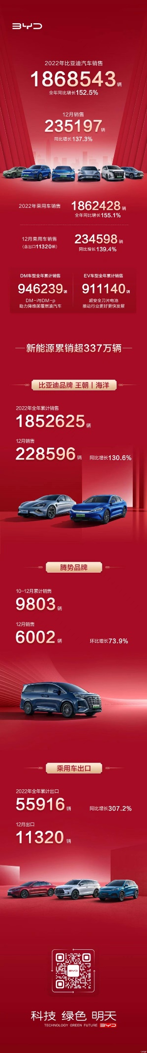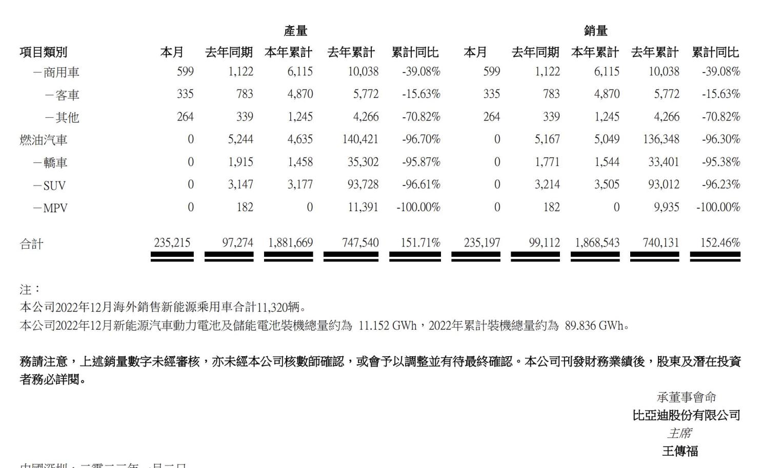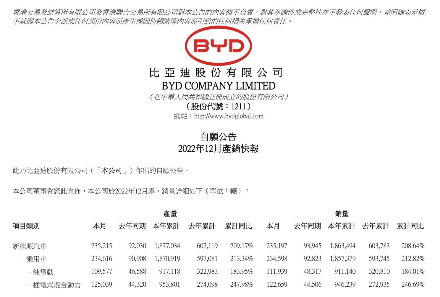 比亚迪股份1月2日在港交所公告,2022年12月新能源汽车销量23.52万辆,上年同期9.39万辆;2022年累计销量186.35万辆,同比增长208.64%。12月新能源汽车动力电池及储能电池装机总量约为11.15GWh,2022年累计装机总量约为89.84GWh。