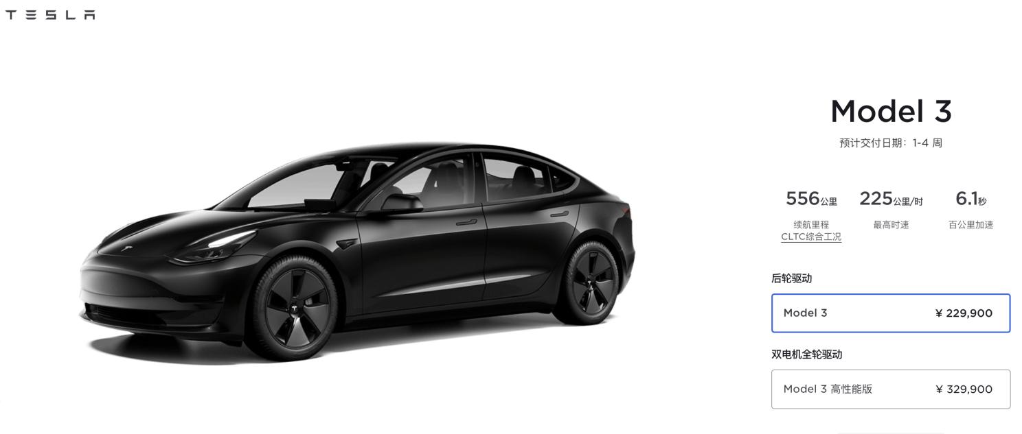 特斯拉在1月6日刚刚调整了旗下Model 3和Model Y的售价,其中Model 3两款车型分别售价22.99万和32.99万元,Model Y共3款车型售价区间为25.99-35.99万元。在降价后,目前官网显示特斯拉Model 3的交付周期依旧是1-4周,特斯拉Model Y则已延长至2-5周。