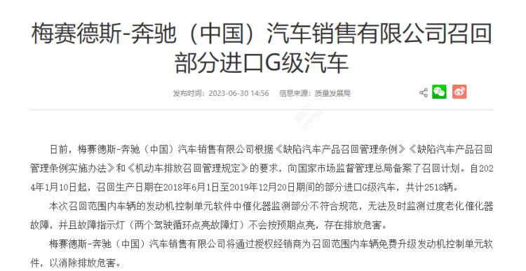 据市场监管总局消息,日前,梅赛德斯-奔驰(中国)汽车销售有限公司根据《缺陷汽车产品召回管理条例》《缺陷汽车产品召回管理条例实施办法》和《机动车排放召回管理规定》的要求,向国家市场监督管理总局备案了召回计划。自2024年1月10日起,召回生产日期在2018年6月1日至2019年12月20日期间的部分进口G级汽车,共计2518辆。本次召回范围内车辆的发动机控制单元软件中催化器监测部分不符合规范,无法及时监测过度老化催化器故障,并且故障指示灯(两个驾驶循环点亮故障灯)不会按预期点亮,存在排放危害。