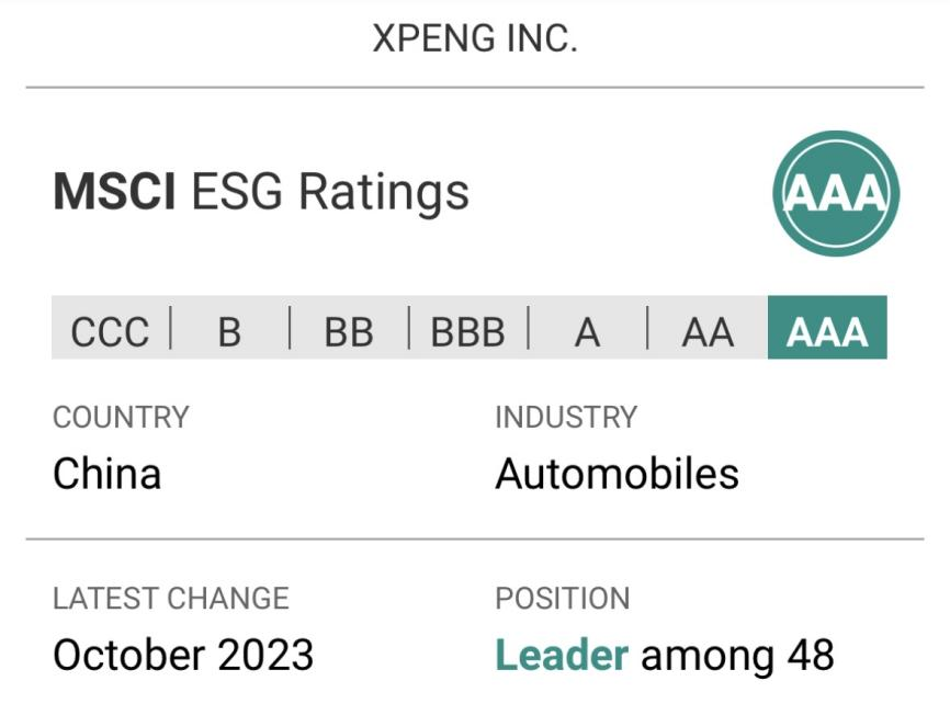 得益于长期的研发创新及可持续发展投入,小鹏汽车已连续四年获MSCI ESG全球车企最高评级,今年再次跃升实现评级上调,拿下MSCI ESG全球最高评级“AAA”级。