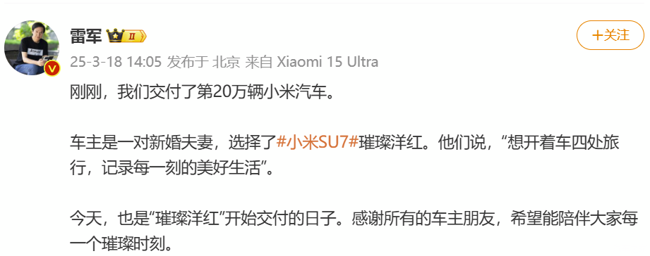 日前,我们从官方获悉,小米汽车正式达成20万辆新车交付。本次交付的是一辆璀璨洋红配色的小米SU7,该配色于2025年1月1日上线,选装价9000元。此外雷军表示,小米汽车一直在全力提升产能,已经取得一些进展,2025年全年交付目标提升至35万。
